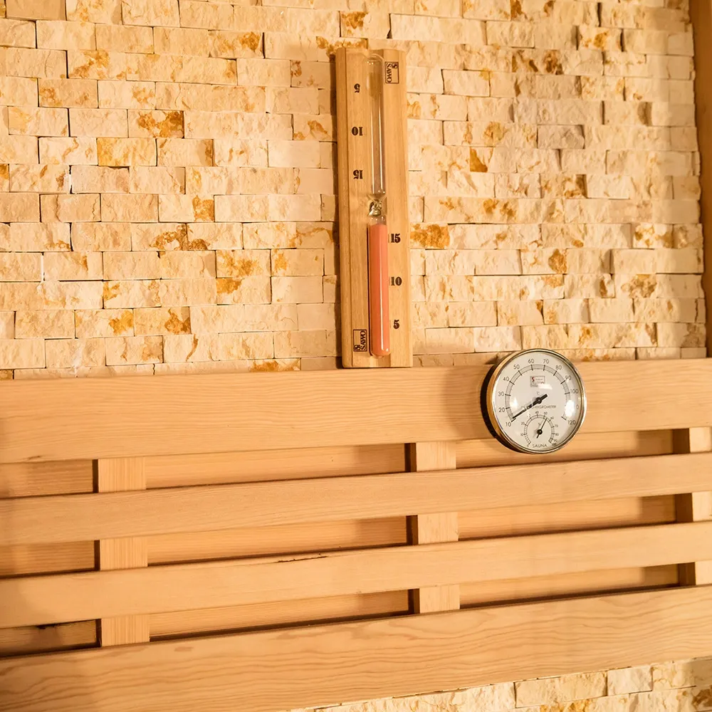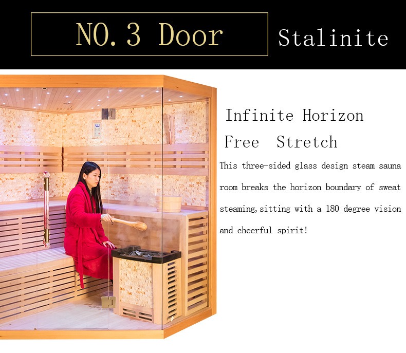 Үш жақты сталиндік мамандандырылған шыны есік құрылымын инновациялық түрде көрсететін бұл әйнек ыстыққа төзімділік пен соққыға төзімділікті қамтамасыз ететін арнайы жоғары температуралық өңдеуден өтеді. Ол тіпті саунаның ішіндегі 70℃-ден асатын температурада да тұрақтылықты сақтайды, өте жоғары мөлдірлікпен және оптикалық бұрмаланусыз. Үш жақты әйнек дизайны дәстүрлі сауналардың тар және жабық сезімін толығымен бұза отырып, 180 градустық кедергісіз кең көрініске қол жеткізеді. Пайдаланушылар саунадан ләззат алу кезінде сыртқы ортамен көрнекі байланыста бола алады, бұл оны үй балкондары, аулалар және басқа сценарийлер үшін өте қолайлы етеді — бұл сізге анағұрлым босаңсыған және жайлы жан мен дене үшін жылу терапиясын қолдана отырып, сыртқы көріністі бағалауға мүмкіндік береді. Бұған қоса, ішкі біріктірілген жұлдызды жарық орта жүйесі үстіңгі және бүйір қабырғалардағы жасырын жарықдиодты жарық жолақтары арқылы жарқыраған жұлдыз әсерін жасайды. Жұмсақ жарық көздің шаршауын тиімді жеңілдетіп, саунаның иммерсивті және жағымды атмосферасын қалыптастырып, жылы буды толықтырады.