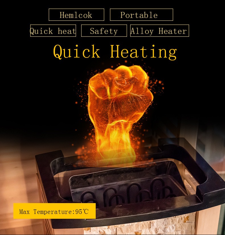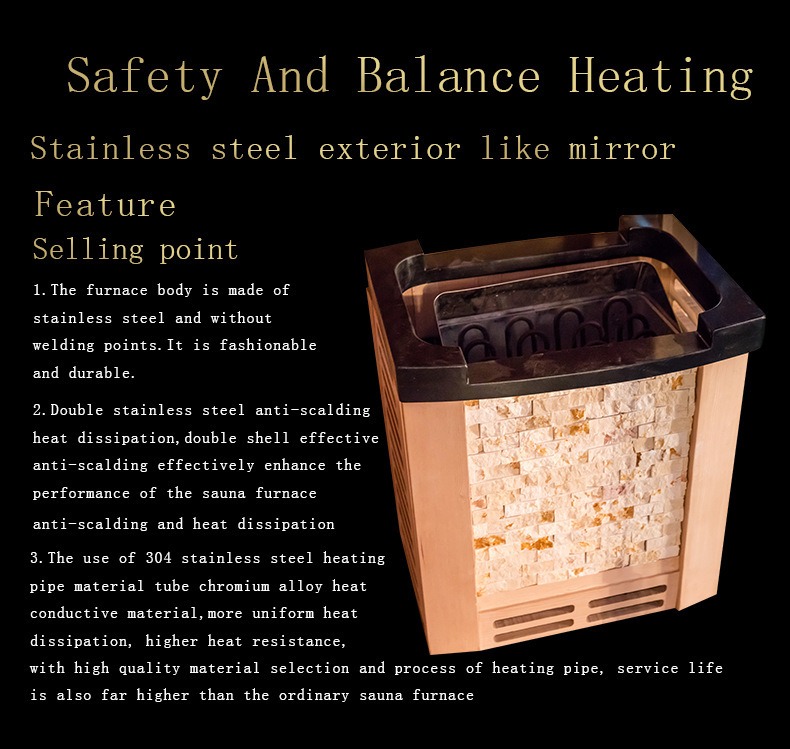 Сонымен қатар, сауна жылытқышы қызып кетуден қорғайтын құрылғымен жабдықталған, ол температура қауіпсіздік шегінен асқанда автоматты түрде өшеді, жылыту тиімділігі мен пайдаланушының қауіпсіздігіне қосарлы кепілдік береді.