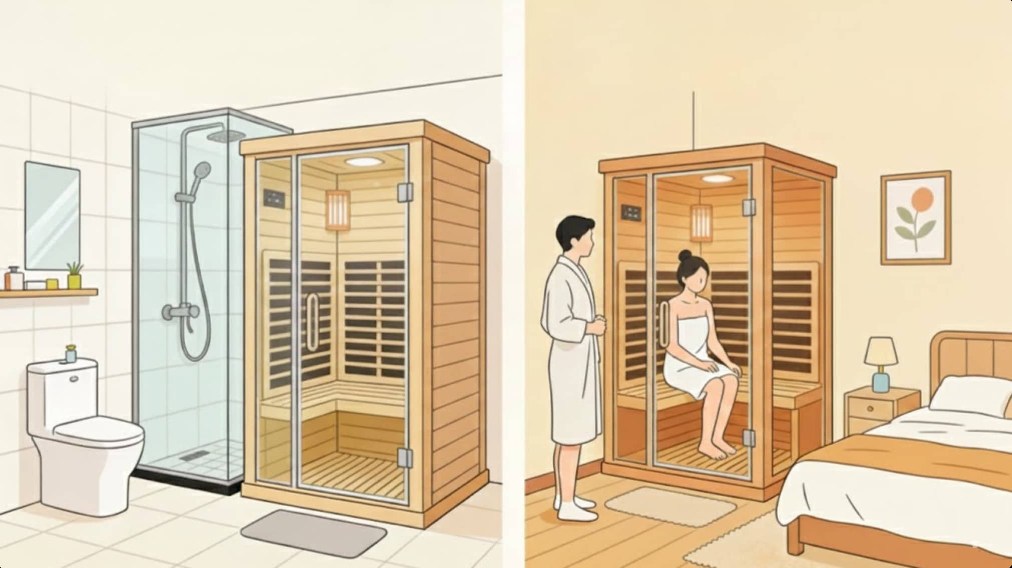 Орнату кеңістігі: Бу сауналары сумен жабдықтау және дренаж құбырларын қажет етеді және ғарыштық ауа өткізуге жоғары талаптарға ие (ванна бөлмесіне немесе арнайы учаскелерге жарамды); Алыс инфрақызыл сауналар сумен жабдықтау және дренажды қажет етпейді, тек қуат көзі. Кішкентай жеке модельдер тек 0,5-1ц кеңістігін алады және жатын бөлмелерде немесе балкондарда икемді орналастырылуы мүмкін.
