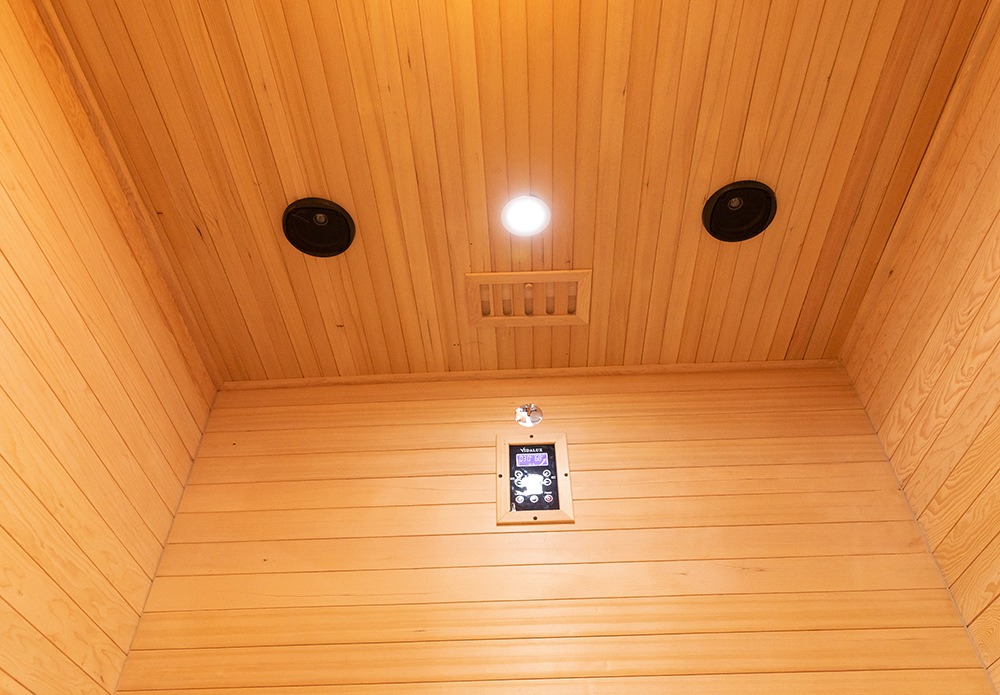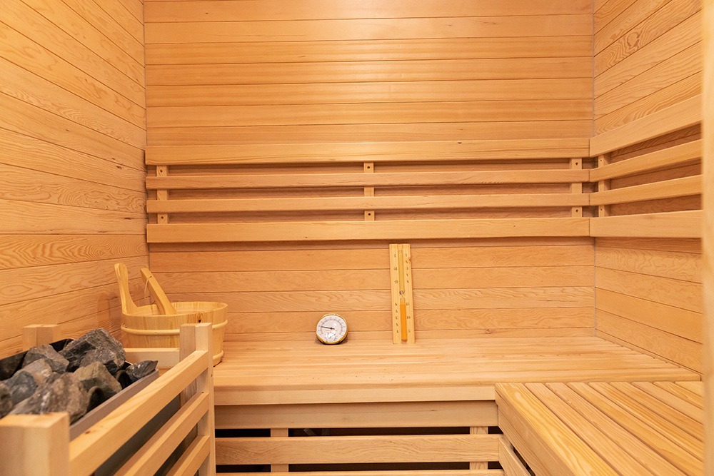 Қабырға шамы және шыны есігі бар ашық темір ағаш сауна бөлмесі. Орындық пен арқалық адам денесінің қисық сызығына өте жақсы сәйкес келеді, бұл оны ұзақ отыру уақытында да ыңғайлы етеді және кері қысымды тиімді түрде таратады. Төменгі жағындағы көп нүктелі желдету дизайны сауна тәжірибесінің жайлылығын одан әрі жақсарта отырып, тиімді ауа айналымына ықпал етеді. Сонымен бірге ол шыныаяқ ұстағыштар, сүлгі сөрелері және газет сөрелері сияқты сақтау жүйесімен мұқият жабдықталған, бұл сізге демалу кезінде қажетті заттарға толық ізгілендірілген бөлшектермен оңай қол жеткізуге мүмкіндік береді.